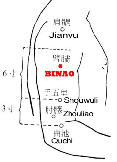 Binao is located on the lateral side of the upper arm, in the visible and tender depression formed between the distal insertion of the deltoid muscle and the brachialis muscle, approximately three fifths of the distance along the line drawn between LI11 and LI15.