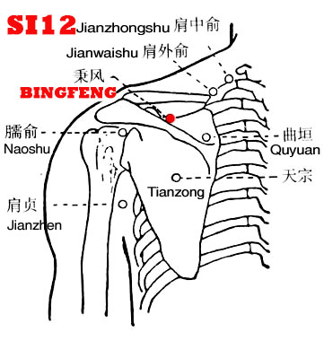 In the centre of the supra-scapular fossa, directly above SI11(Tianzhong), in a depression formed when the arm is raised.