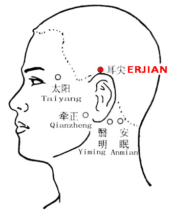 On the top region of the auricle, fold the auricle forward, erjian is at the apex of the auricle.