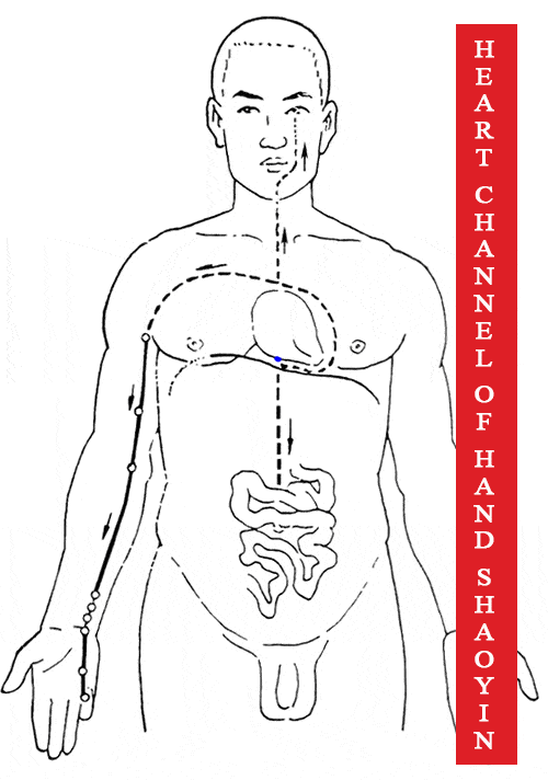 Originates from the heart and pertains to the Heart System (the tissues where the heart connects with other organs). It then descends through the diaphragm to connect with the small intestine. A branch of the channel separates from the heart system and ascends along the esophagus to connect with the Eye System (tissue where the eyes link with the brain) the straight part of the channel derived from the Heart system runs upward towards the lungs, running downwards and emerging from the axilla.