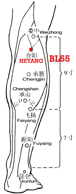 2 cun directly below Weizhong (BL40), between the medial and lateral heads of gastrocnemius, on the line joining Weizhong (BL40) and Chengshan (BL57).