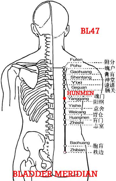 3 cun lateral to Jinsuo (GV8), at the level of the lower border of the spinous process of the ninth thoracic vertebra.