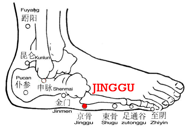Jinggu is an ancient name for the tuberosity of the 5th metatarsal and the point is on the lateral aspect of the tuberosity of the 5th metatarsal.