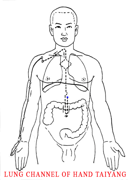 Originates from middle energizer, lung channel descends to connect Large intestine. It then returns and travels along the upper orifice of stomach passes through diaphragm and enters Lungs. It exits transversely from the arm pit from the lung system, where the lung communicates with the throat. Descends along the anterio-medial side of the upper arm, going in front of the Heart Channel of Hand-Shaoyin and the Pericardium Channel of Hand-Jueyin, where it reaches the elbow, goes downward along the anterior border of the radial side on the medial aspect of forearm and enters the cunkou, or the anterior margin of the styloid process of the wrist, where the radial artery is palpated. It then passes through the major eminence,, traveling along the radial border and going out to terminate at the medial side of the tip of the thumb. A branch of this channel splits from the styloid process of the wrist and runs to the radial side of the tip of the index finger, where it connects to the large intestine channel of hand-yangming.