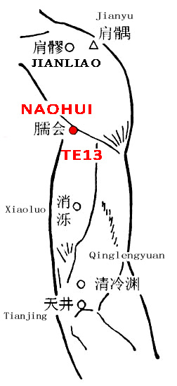 Naohui is at the muscle prominence of the upper arm and is a confluence of this meridian with the Yang Link vessel (Yangweimai).