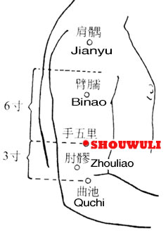 Shouwuli is on the upper arm, 5 cun below Tianfu (LU3).