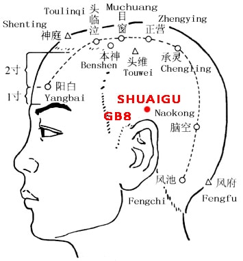 Shuaigu lies in the temporal region, in the slight depression 1.5 cun directly above the apex of the ear.