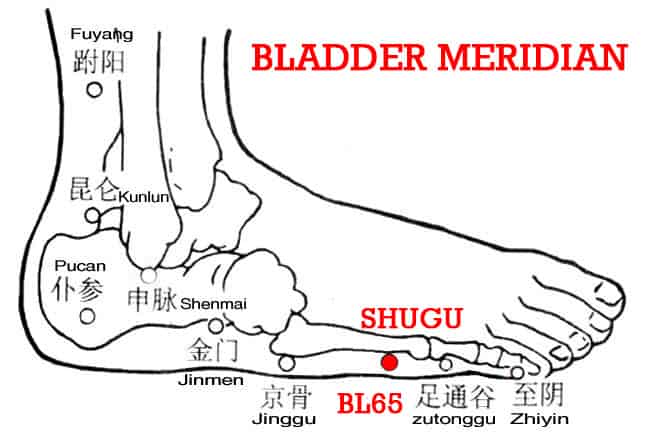 Shugu, BL65 is an ancient name of the head of the 5th metatarsal and the point is on the lateral inferior aspect of the head of the 5th metatarsal.
