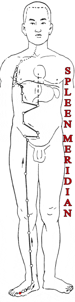 Originates from the tip of the big toe and travels along the border between red and white skin of the medial aspect of the foot, ascending anteriorly to the medial malleolus towards the medial aspect of the leg. It crosses over and goes in front of Liver Channel of Foot-Jueyin 8 cun above the medial malleolus, passing through the anterior medial aspect of knee and thigh; it then enters the abdomen and spleen, its penetrating organ, and connects with the stomach. (The external pathway of the channel distributes in the abdomen 4 cun lateral to the anterior midline).