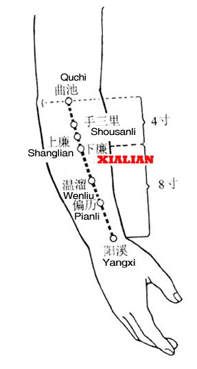 Xialian is located 4 cun distal to the lateral end of the elbow crease in the direction of the anatomical snuffbox and on a line connecting Yangxi (LI 5 ) and Quchi (LI 11).