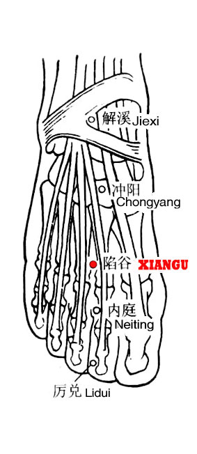 Gu refers to a depression on the body surface. Xiangu is in the depression between the second and third metatarsals.