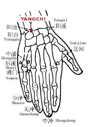 Yangchi is in the depression on the back of the wrist and the qi of the meridian flows like water into a pool.