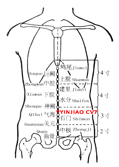 Yinjiao CV7 is 1 cun below the navel, and is the crossing point of the Conception Vessel (Renmai), the throughfare Vessel (Chongmai) and the kidney meridian.